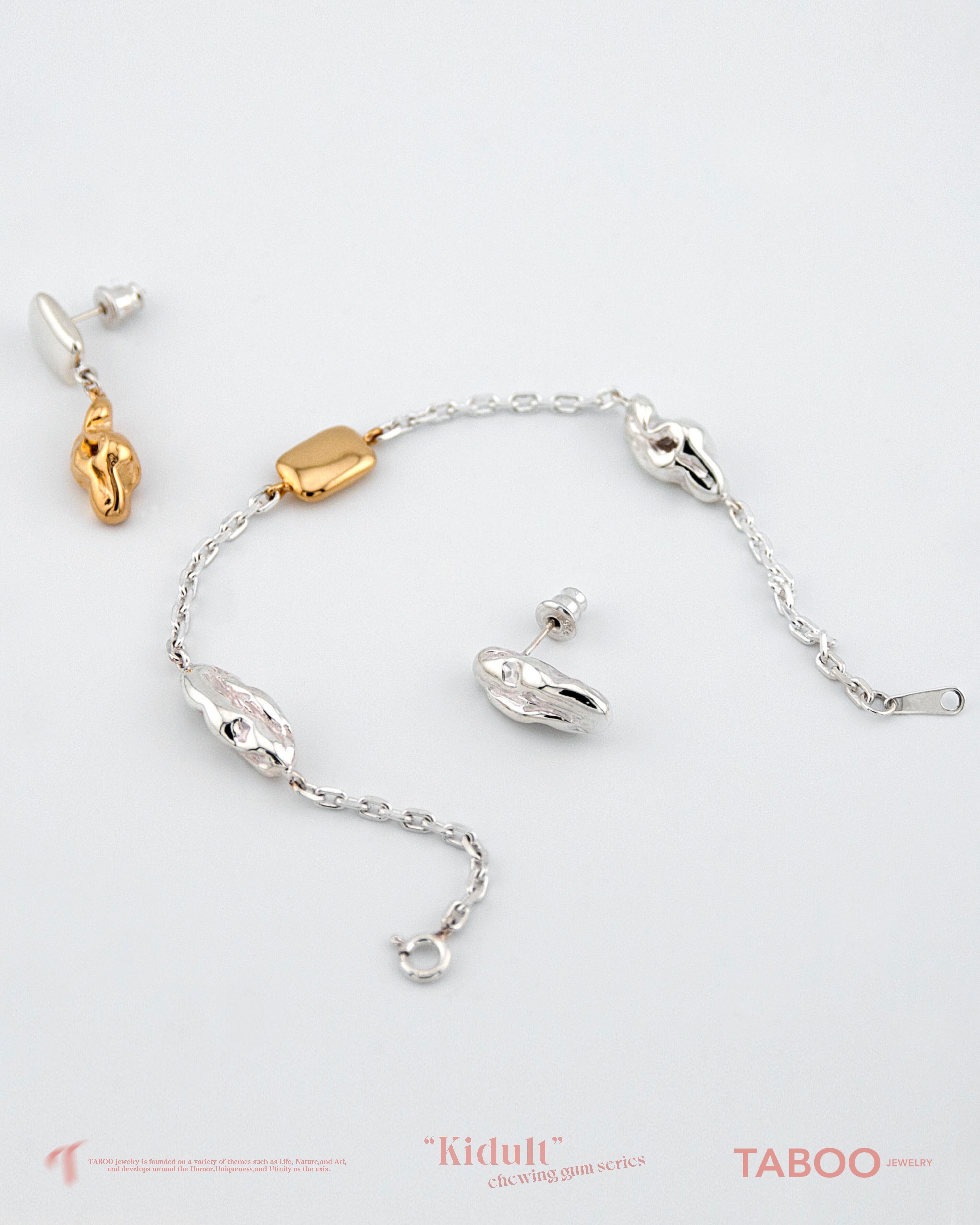 抽象化したチューインガムモチーフのブレスレット。ぷっくりした造形が可愛らしく、バイカラーデザインが目を惹きます。