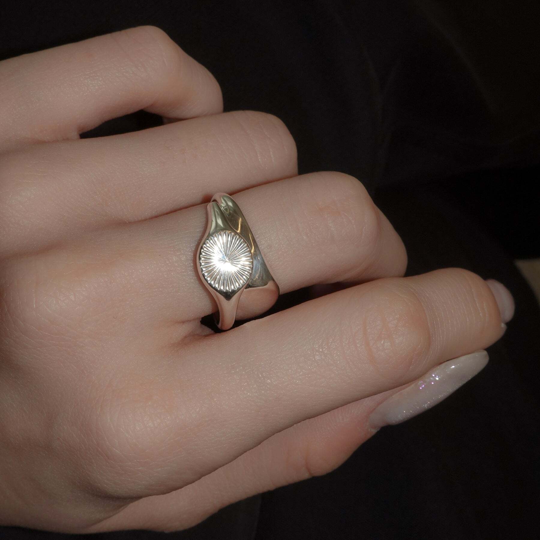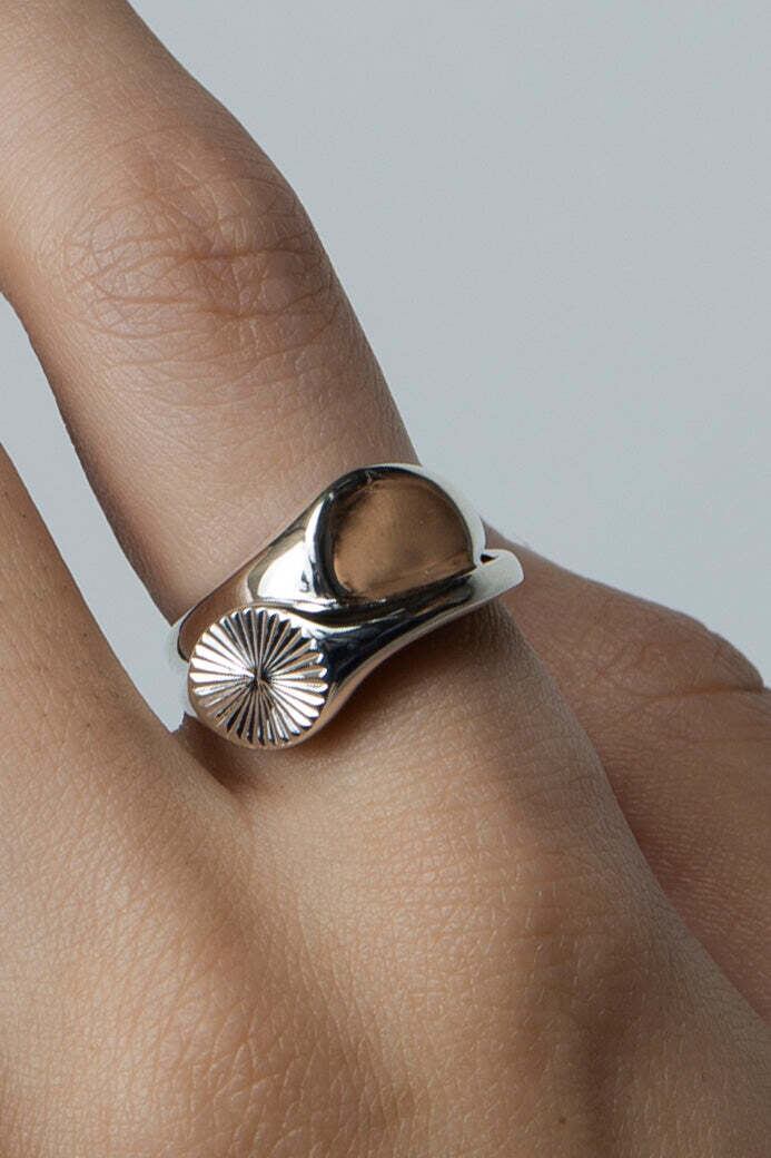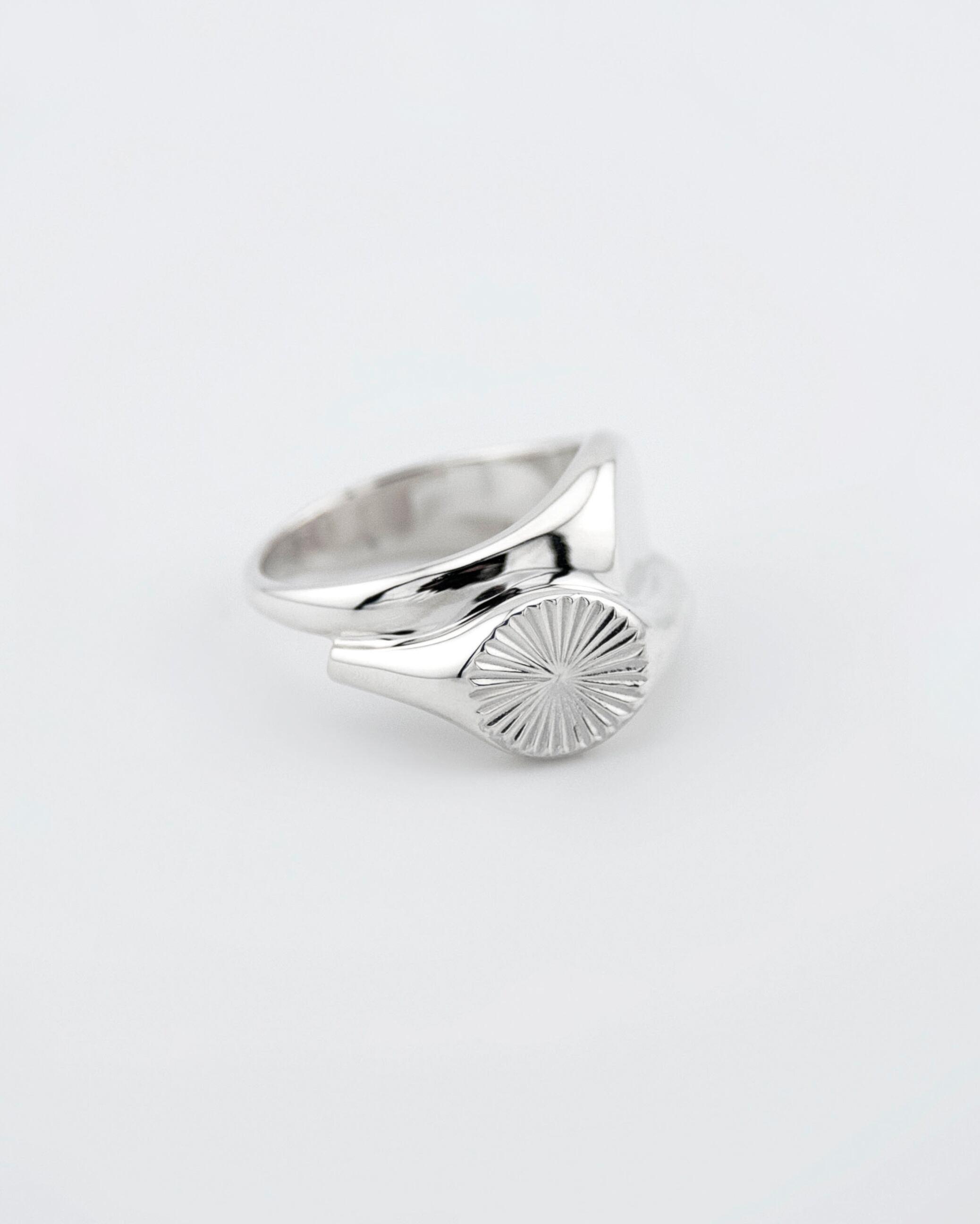 W Ring Ringは、2つのシグネットリングを組み合わせたリング。繊細な模様と鏡面仕上げの二面性に、アームを切り離して融合させたディテールを加えた、個性が際立つリングです。