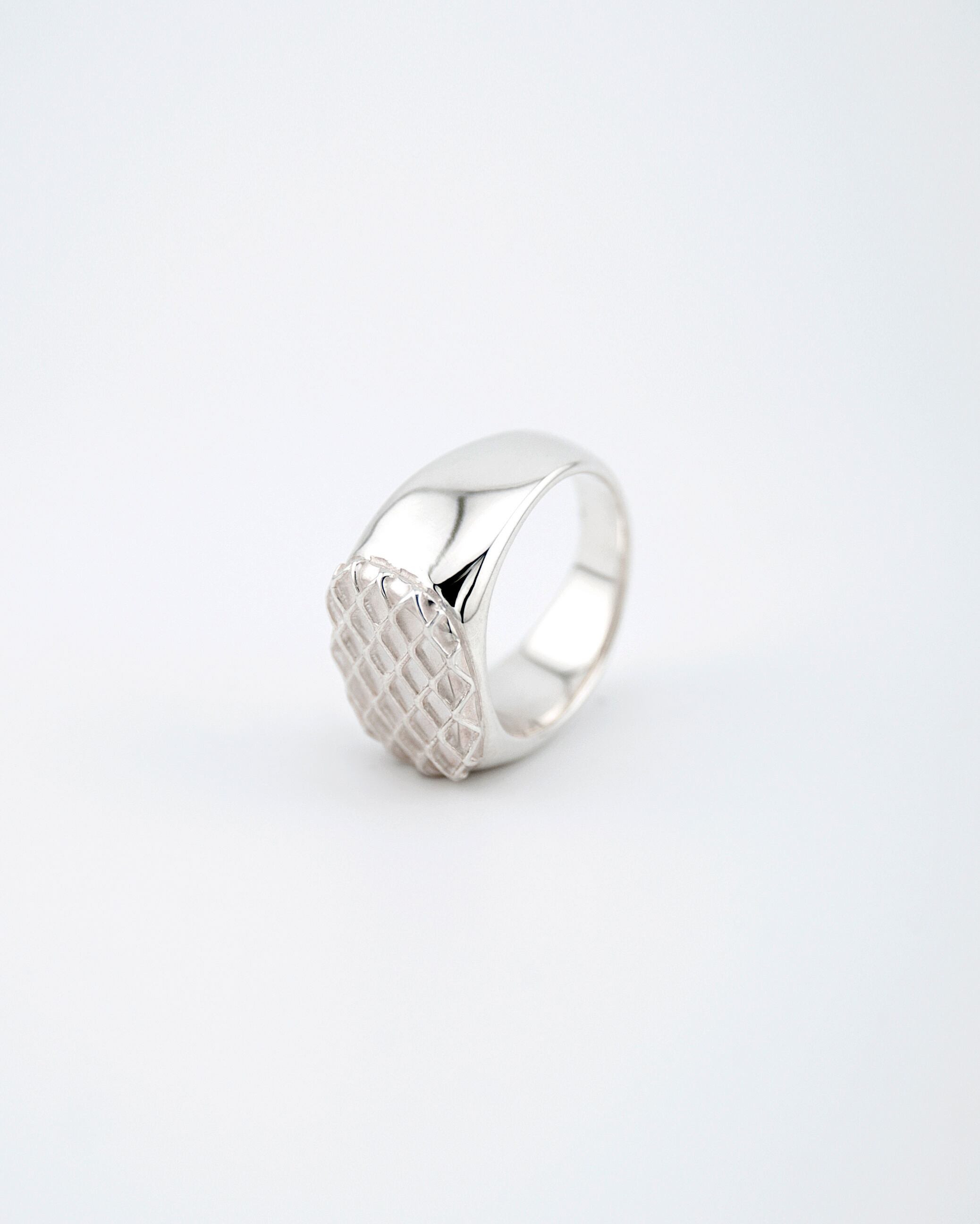 Mesh signet Ringは、メッシュを入れたシグネットリングであり、マットな質感や鏡面仕上げのメリハリを感じられ、存在感のあるリングとして長く愛用できます。